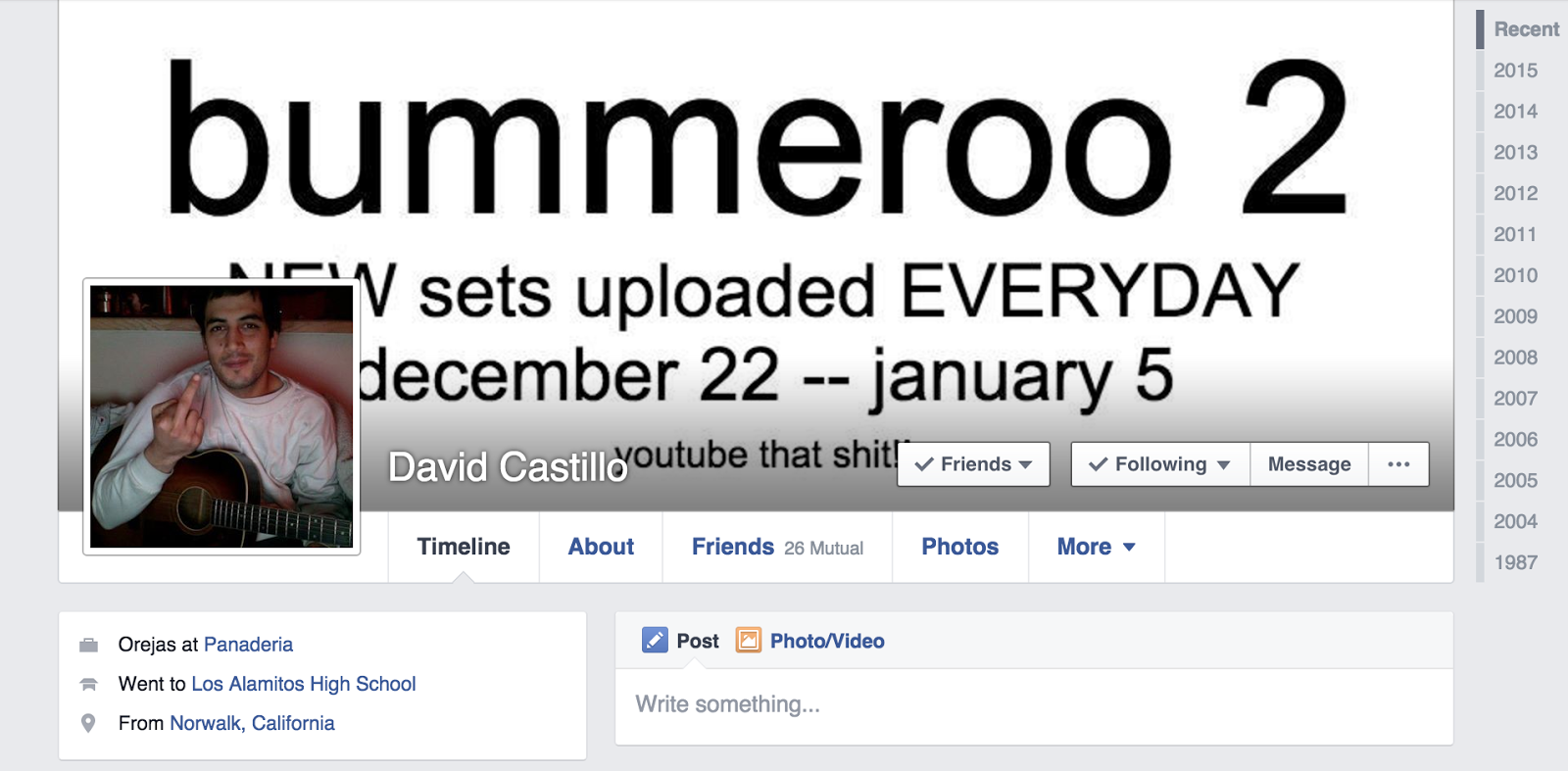 We are about to finish the second Panaderia album so I hope we can release it late Summer/early Fall. I’m working on a second David & Company album that I hope to release with Gnar Tapes in the Fall. I have half of the CHUFFED album finished just writing/recording the second half and I’m talking to my friend Ben Katzman about possibly releasing that on his east coast label, BUFU. For non-music-projects I still have Panaderia season 2 to make. The first episode uploads 2/14/2016 and I’m going to try to do 1 a week like I did with the first season. But, my biggest desire is the make a VHS collection of all the video projects I did in 2015. All together I have over 4 hours of projects that include: Panaderia Season 1, a PIZZA TIME documentary called “Rest In Pizza”, a documentary called “Do Anything U Wanna Do” about the tour I played bass with AJ Davila y Terror Amor & a short film I made called “Always On Vacation”. If this happens it will be the David Castillo “Criterion Collection”.